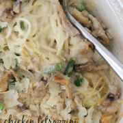 Have you ever made Chicken Tetrazzini Casserole? It's a delicious meal idea that's one of my new favorites! We love our Chicken Noodle Casserole so I thought I'd try making a few more delicious creamy chicken dinner options and I'm so glad I did! This turned out amazing with the homemade sauce and my favorite mushrooms and asparagus! Yum! Check out the recipe below!