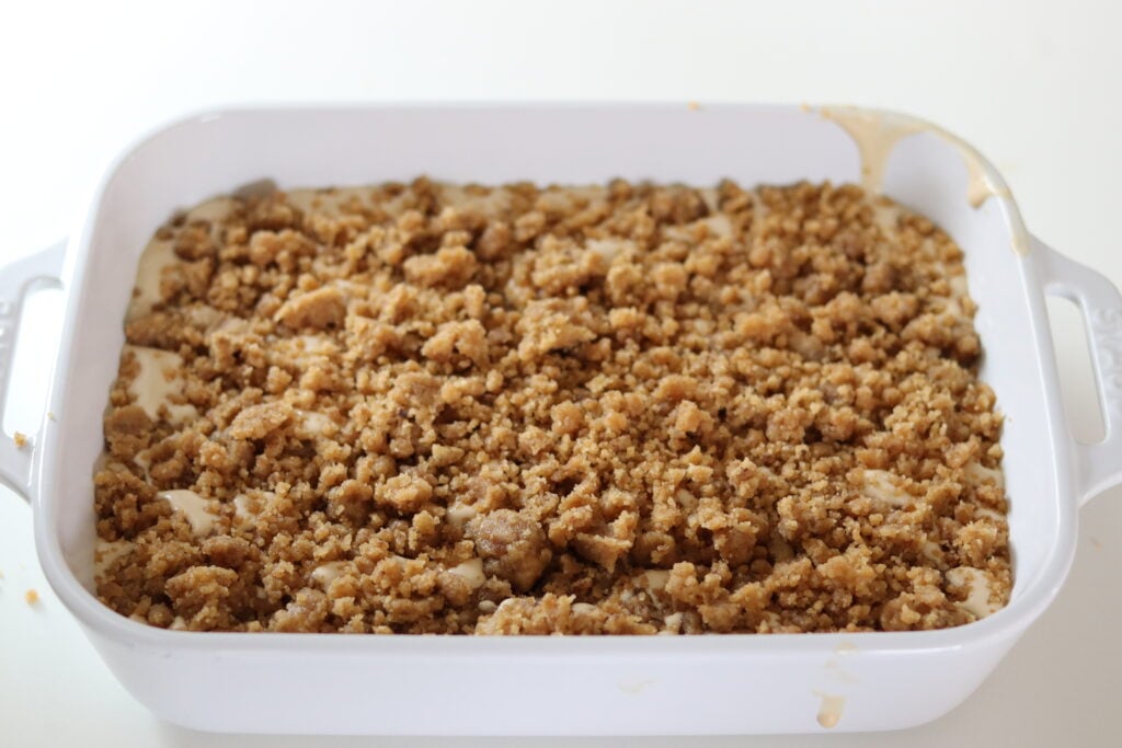 - Make the crumble topping: In a small bowl, combine flour, brown sugar, melted butter, vanilla, and maple extract. Sprinkle over the top of the cheesecake filling.