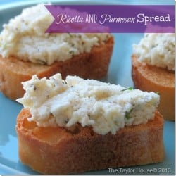 I have another delicious recipe to share with you today! I love ricotta cheese so finding new ricotta recipes to try is awesome. This Ricotta and Parmesan Spread recipe is so easy and works well as a snack, party appetizers, taking to potlucks or holidays. It is so quick and easy to make and transport by toasting your bread ahead of time and taking the spread in a nice bowl to serve. I have to be honest, I made it one morning and ate way too much for breakfast one day. What? You don't eat cheese spread when you first get up? I may have a problem, I know.
