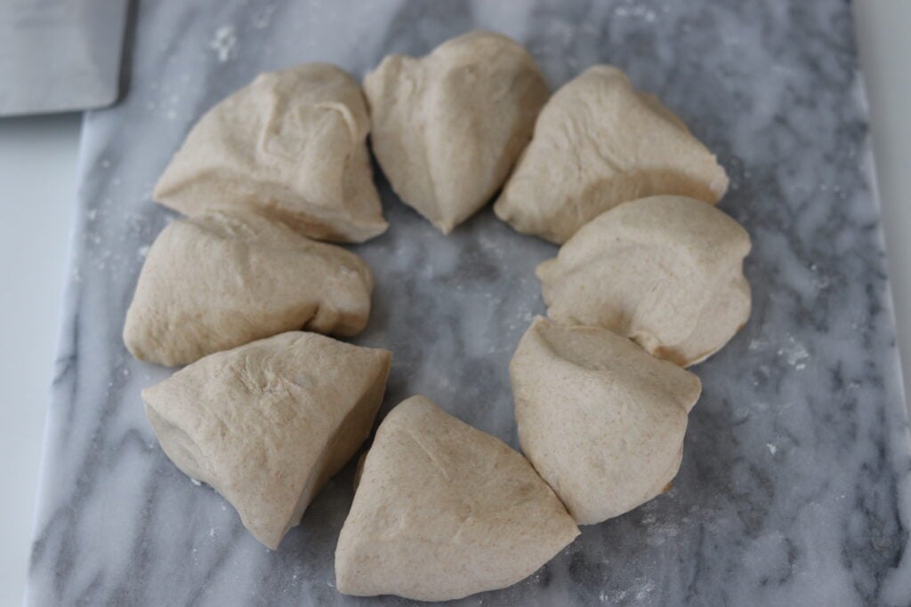 - Once risen, punch down the dough and divide it into 8 equal pieces.