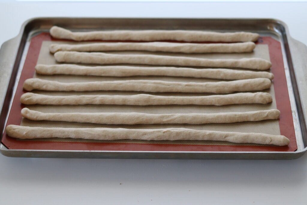 - Cut the pieces into bite-sized chunks (approximately 1 inch long) and place them on a parchment-lined baking sheet.