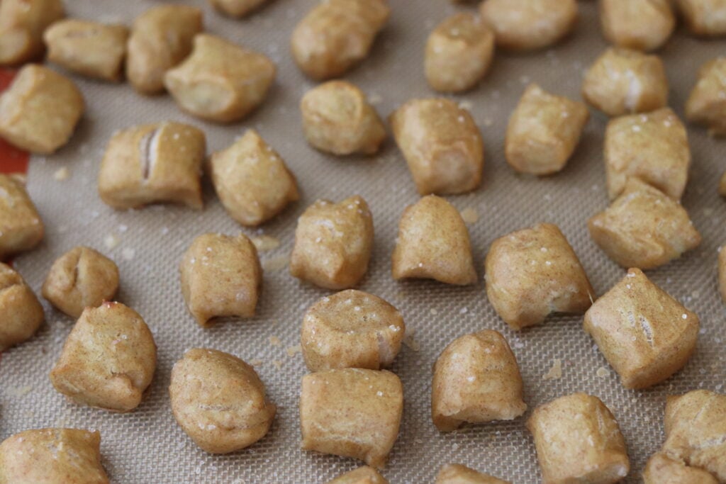 - Drop pretzel bites in (about 8-10 at a time) and boil for 30 seconds.